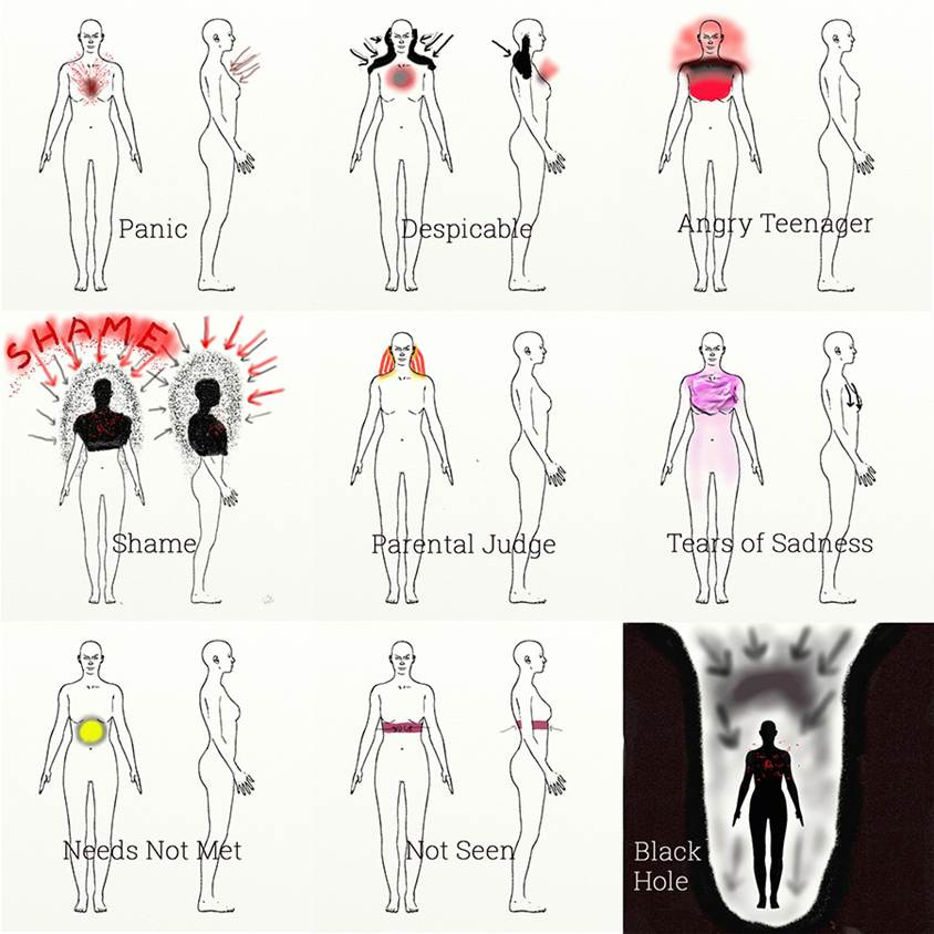 The names of the states give you a sense of what this entire experience of what she referred to in summary as “anxiety” was like for her, and some hints about its origins. Read through this list and sense into the images. Try to imagine the experience of what it was like to be her, holding those reactive states as a set of distinct parts of her experience, all combining into this “weight of anxiety” as she describes it in her reflections below.