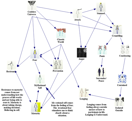 The first feeling I mapped was fear of rejection. First I had to get the words right. “Fear of rejection” is an abstract phrase that could apply to just about anyone. It was not mine. What it really felt like was crumbling. I felt other people’s moods and shifts so acutely that a slight dismissal or an offhand remark could cause me to collapse inside. So I made the transition from the rather generic, possibly universal “fear of rejection” to the more personal “crumbling”.